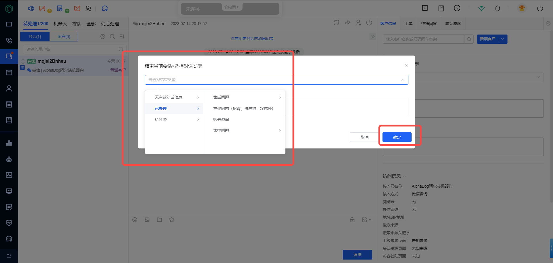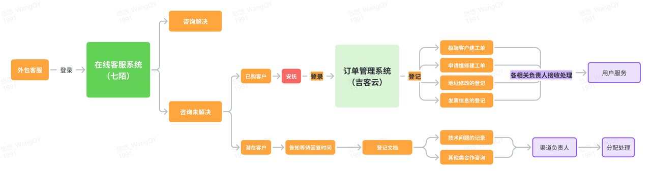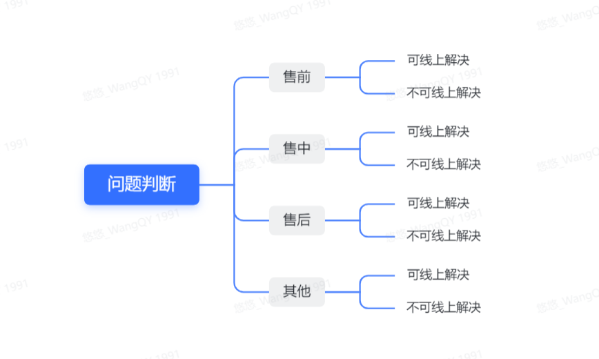 判断客户的问题归属于什么类型,业务分为售前、售中、售后、其他业务,处理方式分为可线上沟通就可解决的问题、需要其他信息确认后再回复的
