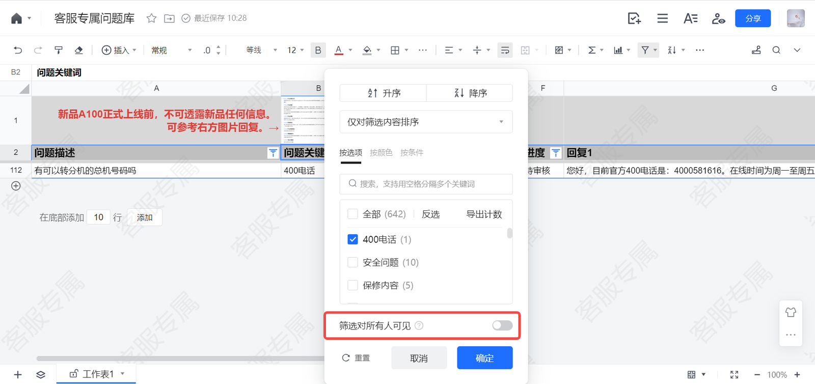【操作】在客服专属问题库里,关闭“筛选对所有人可见”界面,“按条件”-选择“文本类”进行搜索。