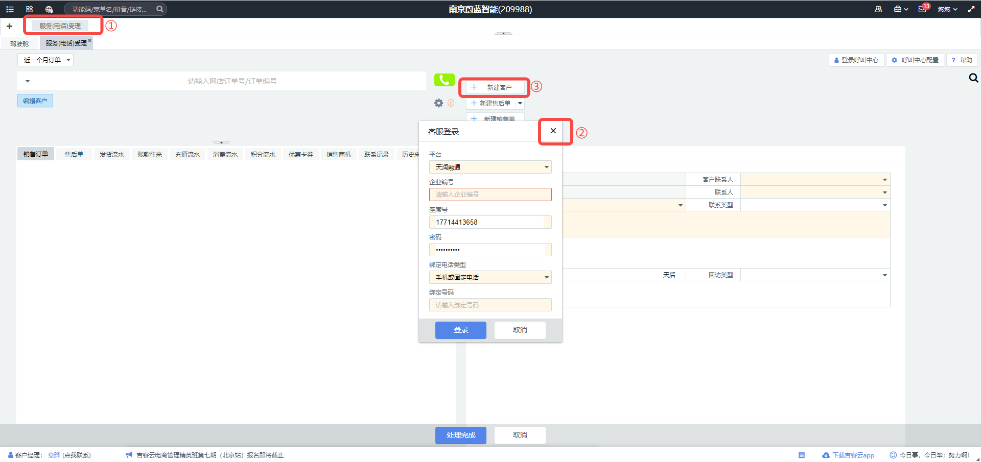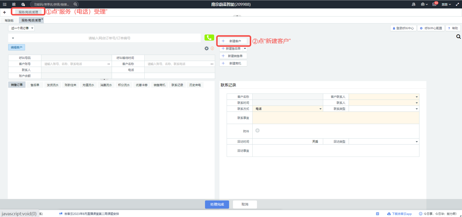 【操作】①点“服务(电话)受理”;②叉掉小弹窗;③点“新建客户”