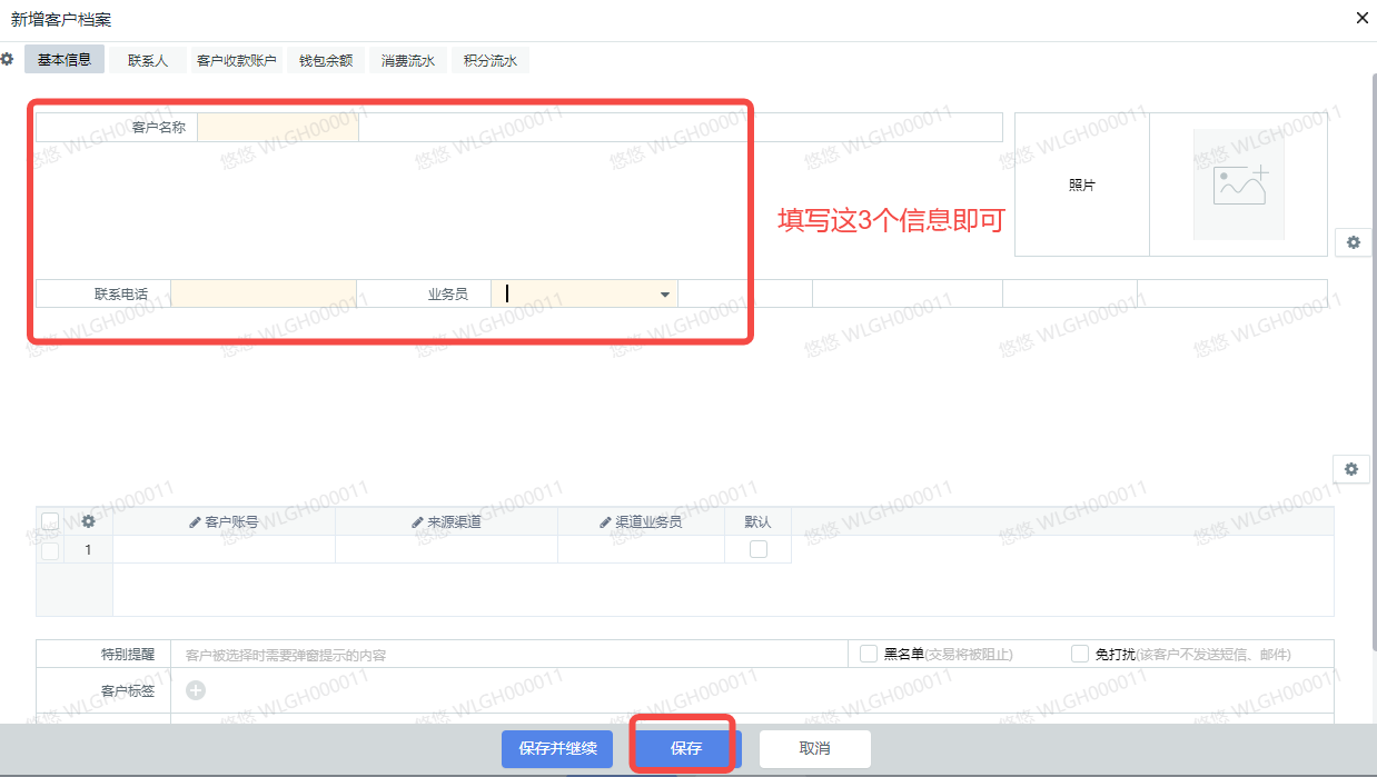 【操作】④填写“客户姓名”;填写“联系电话”;业务员选自己。⑦点“保存”。
