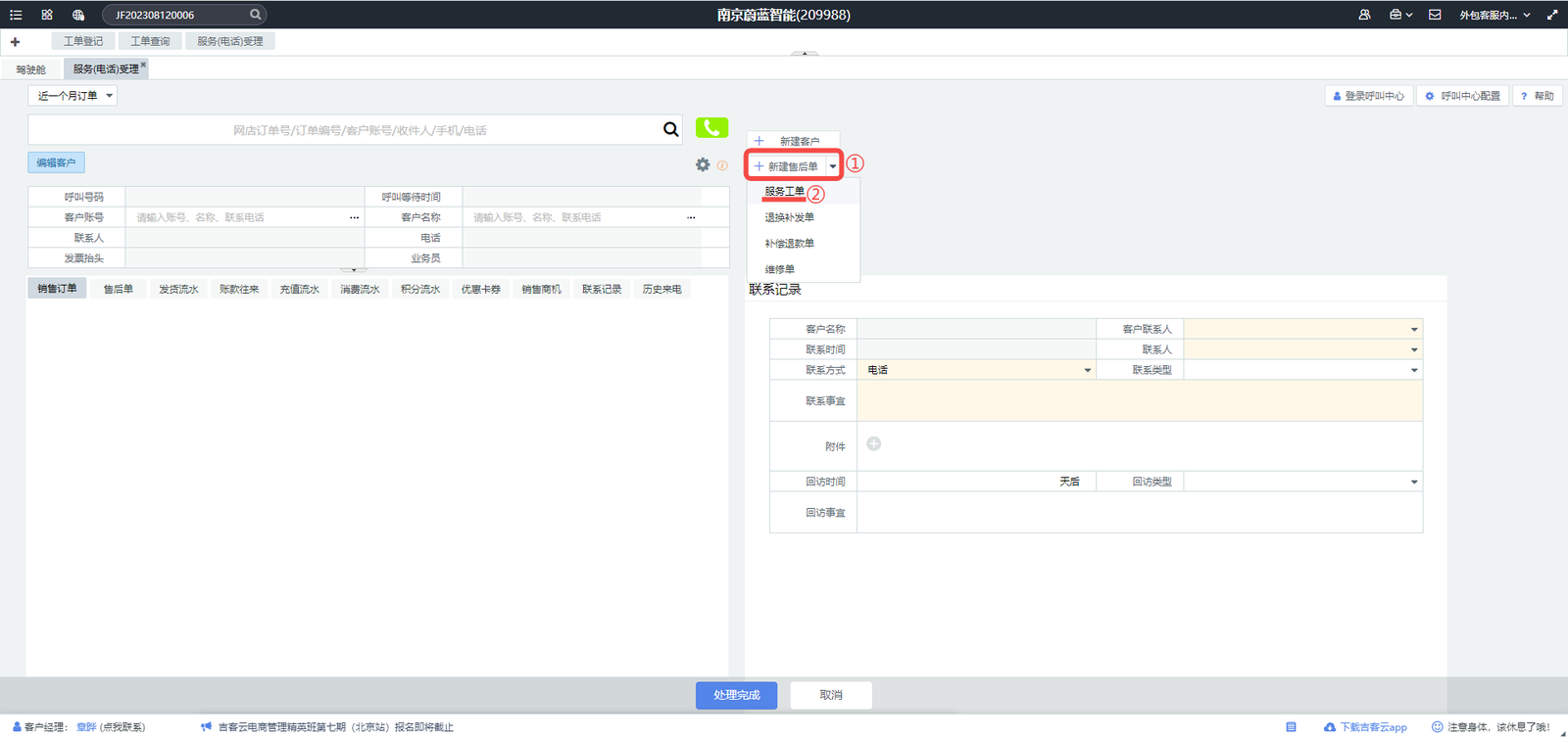 【操作】点“服务(电话)受理”;①直接输入客户任意信息,如:订单/姓名/电话信息,查询订单;②点“新建工单”;点服务工单。