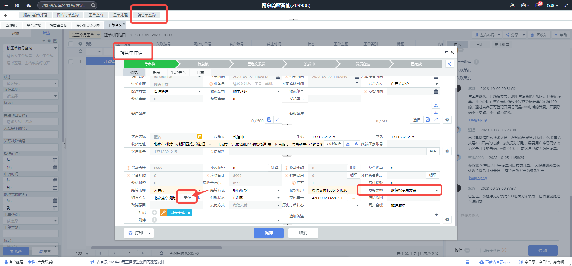 另一种,可以通过【吉客云】“销售单查询”-输入客户订单信息搜索出订单查看