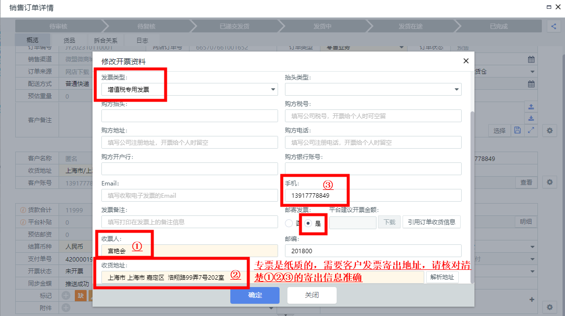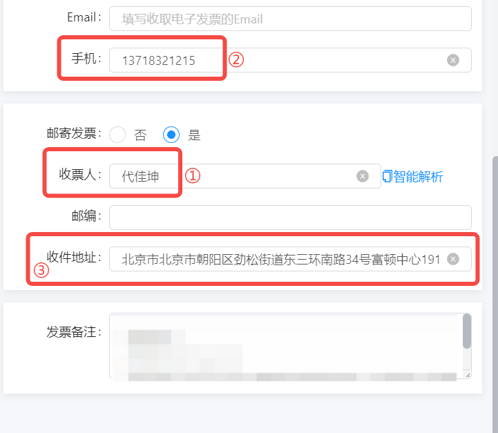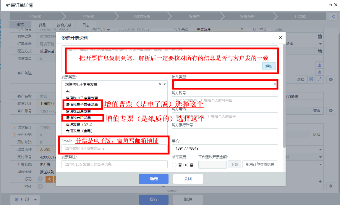 点解析,核对确认智能解析的发票寄出地址信息没有错误与客户一致,点保存。(手机号码位置有点特别,在上面,确认①②③解析的都对,就可以的)
