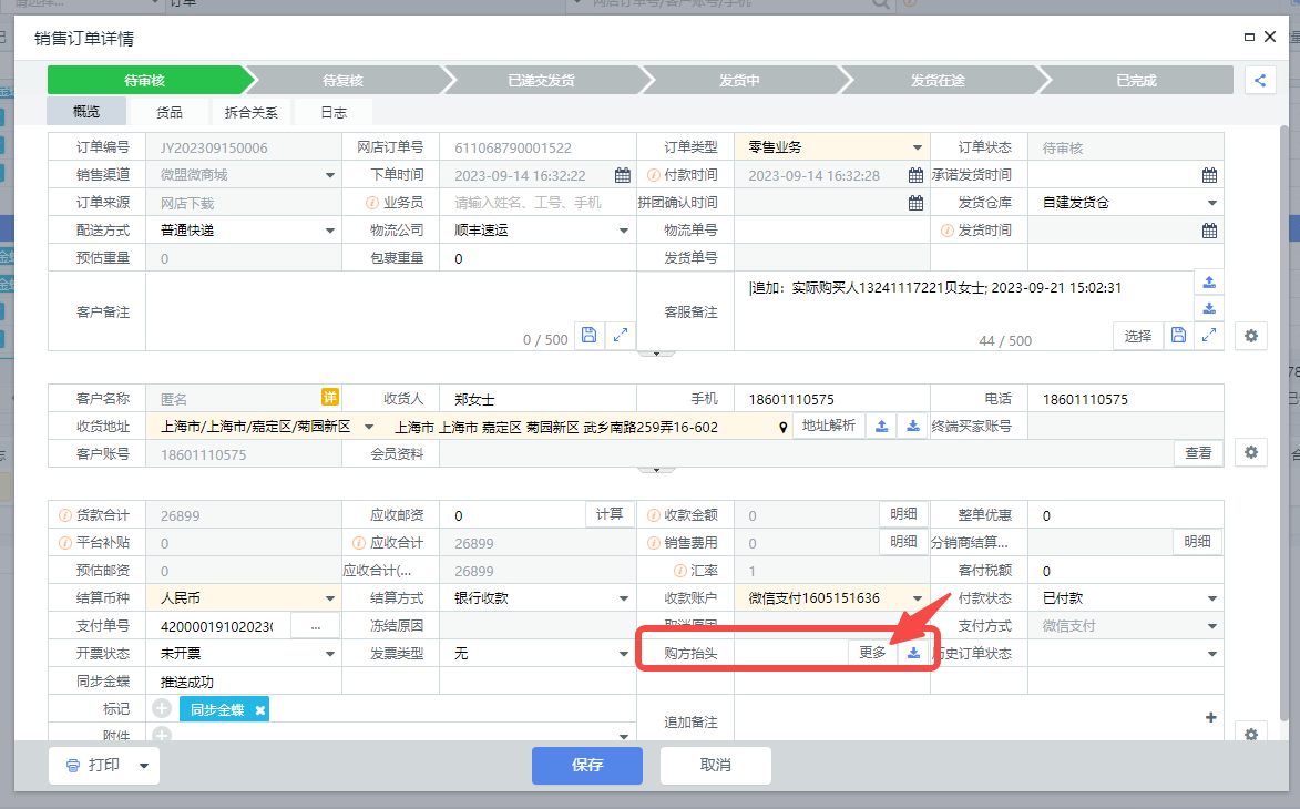 另一种,可以通过【吉客云】“销售单查询”-输入客户订单信息搜索出订单查看,点击“购方抬头”的“更多”